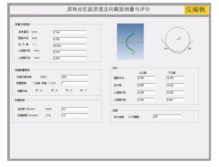 支持絲杠、螺母測量;支持左旋、右旋;能夠實現(xiàn)階段性掃描,由于螺母外圓柱上有安裝孔,所以掃描滾道時需要設置斷點,避開空位掃描測量;