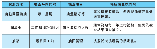 表表示潤(rùn)滑劑的檢查與補(bǔ)耠間隔之一般指標(biāo)。捕時(shí)要擦掉附著于螺桿軸的舊潤(rùn)滑膏后再加以捕耠。